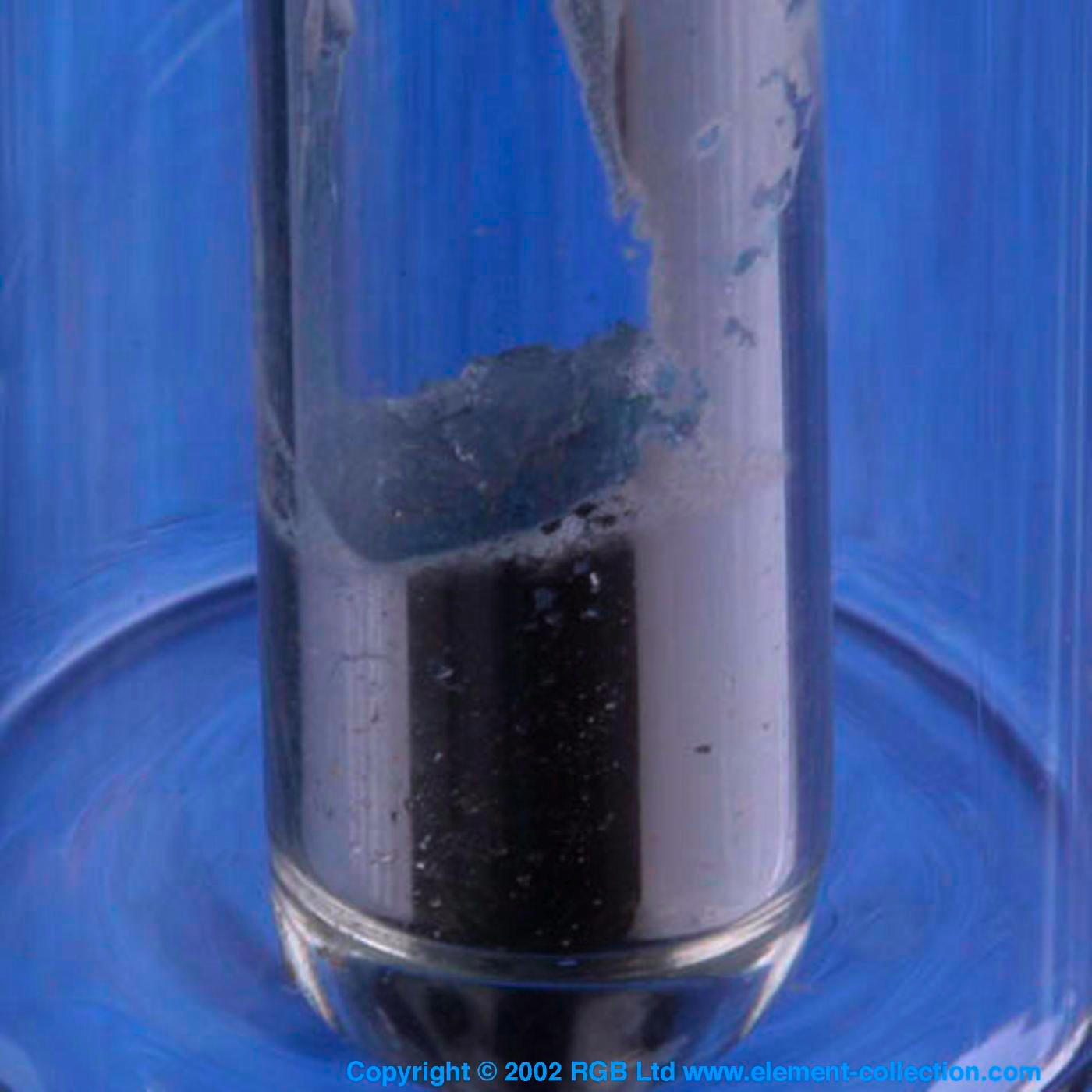 I feel a bit guilty about this sample. It started as a perfectly good, said to be entirely functional, Efratom FRS 10MHz time standard, which I ruthlessly tore apart to get to the glass ampule you see here, which contains a tiny amount of rubidium. It will never tell time again. In operation heating coils would have raised the temperature of the ampule enough to vaporize the rubidium. Radio frequency coils then excite the rubidium atoms and measure the frequency of their electronic transitions, which are very stable. (Cesium atomic clocks work on the same principle and are even more accurate, but for some reason rubidium ones are cheaper.)