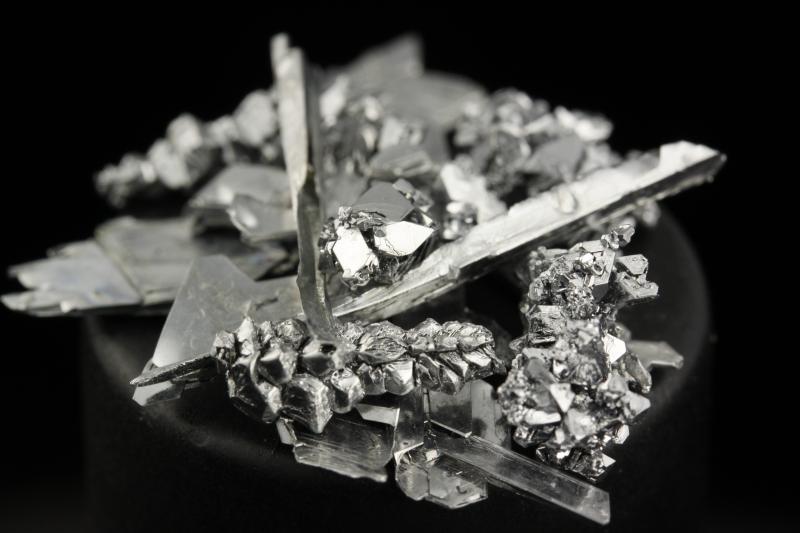 These shiny crystals were formed by slow electrodeposition, and are in needle, plate, and octahedral forms.