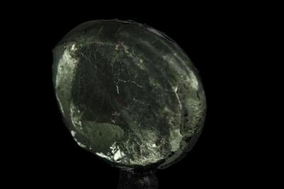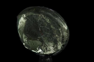 This germanium button was melted from standard 5N+ pure melt stock in an vacuum arc melter- the germanium and surrounding crucible were heated much more than was necessary to melt the small blob, so that the rate of heat loss was slower and greater crystalline structure had time to develop. Although this is the same purity of material that is used to grow the oft-seen trapezoidal monocrystalline bars of germanium, arc melting is of course much more of a chaotic, disruptive, and impure process, where large crystalline grains are not present to the extent that the purity of the original melt stock would allow for. Nevertheless, crystals resembling ice on a window pane are visible on the surface, as I had hoped for when melting it.
