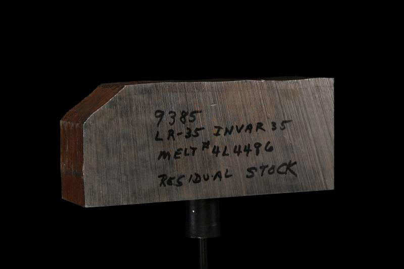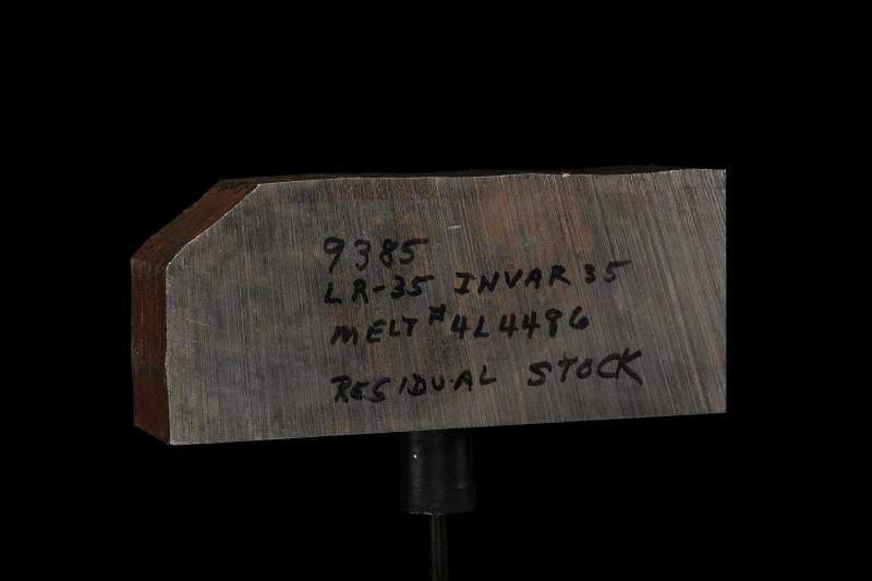 Invar is an alloy of primarily iron (64%) and nickel (36%), known for is unusually low coefficient of thermal expansion. This makes it useful for precision instruments and measuring devices that should as much as possible remain the same size and shape at all times. This block would be excellent for smashing such a precision instrument into a tangle mess of broken gears and dials. It weighs about 13 pounds and appears to have been roughly cut with a large band saw.