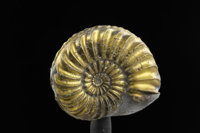 A fossil can be formed out of all kinds of different minerals, so there are really two entirely separate ways to describe one: What it's a remnant of, and what it's made out of. This sample is a fossil of a type of animal called an Ammonite, but even more interestingly, it happens to be made of pyrite (iron sulfide), also known as "fool's gold" because it looks a lot like gold.