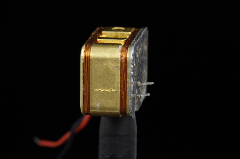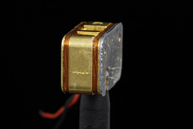 This is the smallest currently available rubidium cell from inside such a time standard. You can just barely see the drop of rubidium inside the square glass cell (which is only about 1/4" on edge, to give you an idea of how small this thing is). The picture is focused such that the rubidium dot is in focus on the back face of the cell: See the 3D version to get a better view of the unit as a whole. In operation the cylinder next to the cell heats up (you can see the electrical contacts on the back in the 3D view) to the point where the rubidium is vaporized, the coils wrapped around the unit as a whole sets up a magnetic field, and it is the frequency of an electronic transition of the vaporized rubidium atoms in this field that is used as the time standard.