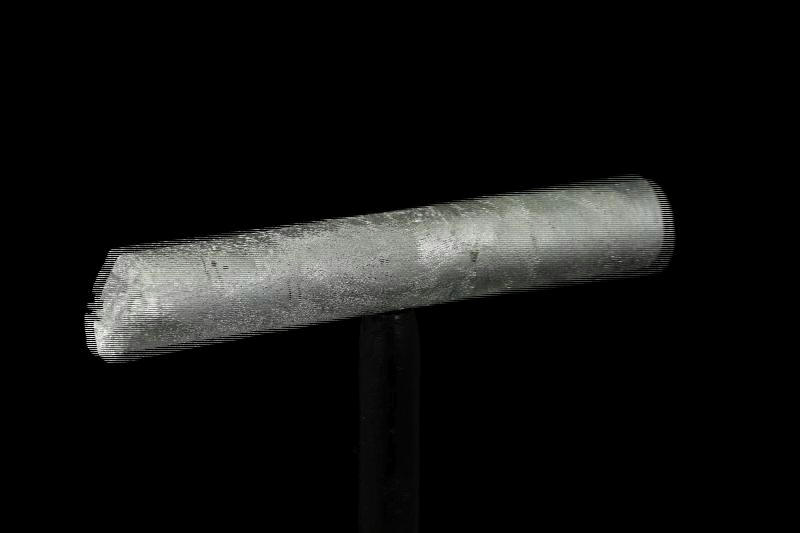 This bar was cast from very high purity aluminum pellets in a mold made by drilling a hole in a graphite slab, then etched with diluted potassium hydroxide. It was cooled slowly to allow crystals inside to grow large, as you can see from the size of the textured patches: Each patch represents a boundary of a single crystal.
