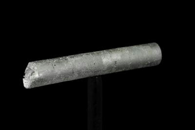This bar was cast from very high purity aluminum pellets in a mold made by drilling a hole in a graphite slab, then etched with diluted potassium hydroxide. It was cooled slowly to allow crystals inside to grow large, as you can see from the size of the textured patches: Each patch represents a boundary of a single crystal.