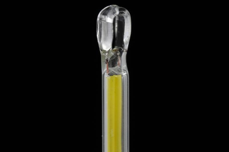 This glass loop contains two platinum electrodes a fixed distance apart. Dipped into a liquid it can be used to measure the conductivity of the liquid, thus indirectly measuring the concentration of something, salt for example, in the solution. Platinum is a good material for such electrodes because it does not corrode even under very strong chemical attack.